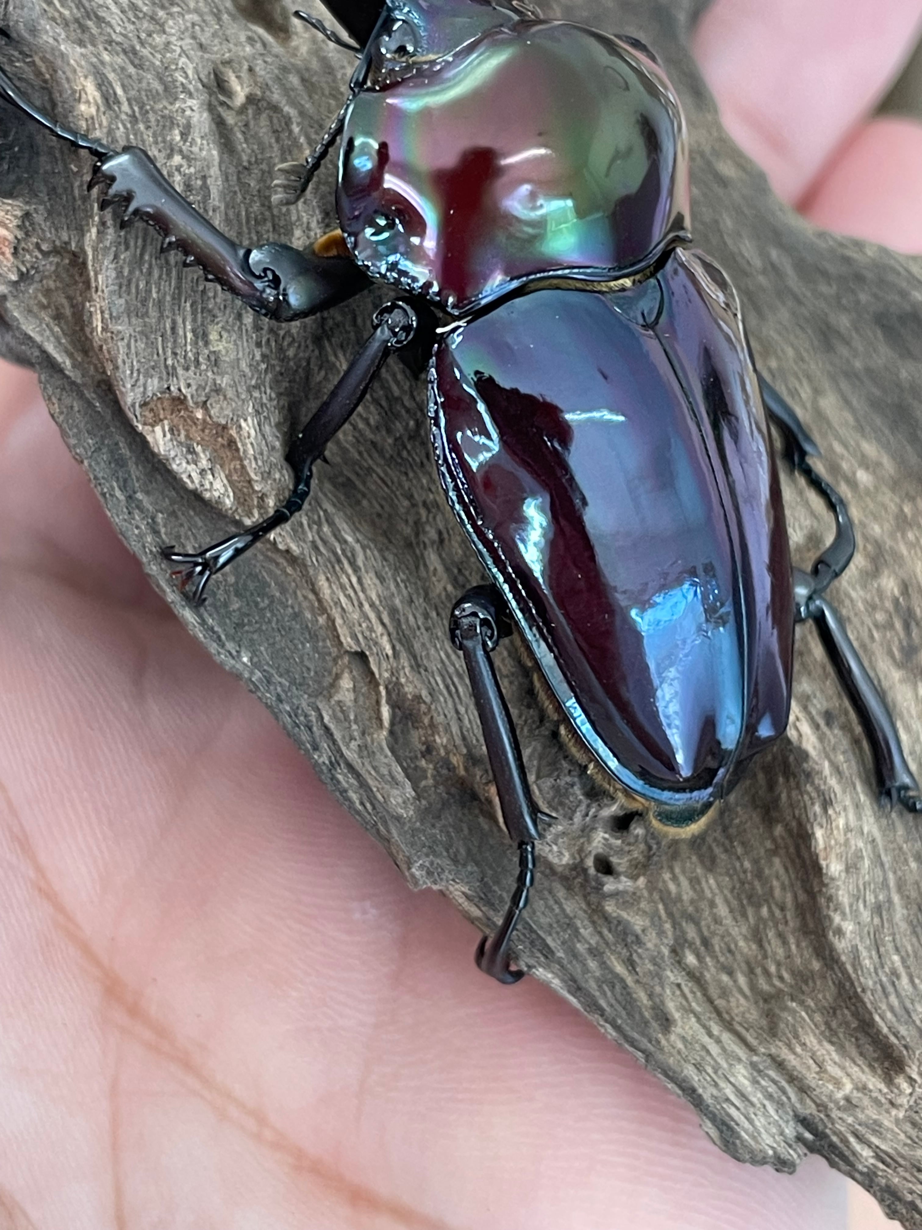 前胸の光沢は、交配させながら現状より強い光沢を目指して累代してます。前胸には、グリーンの差し色も入った兄弟が多いです。