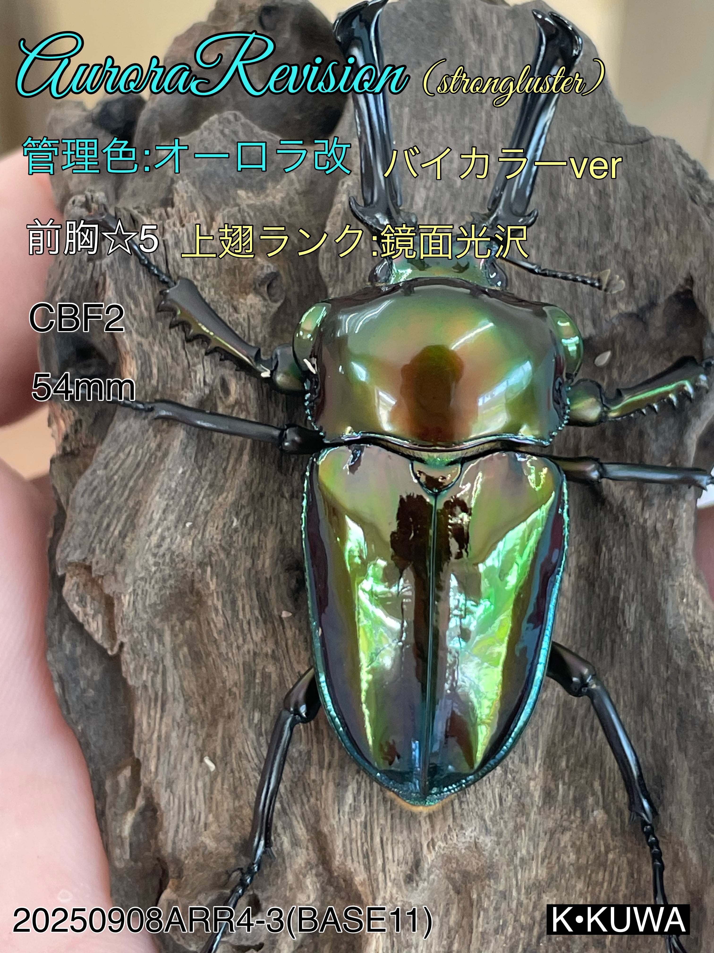 オーロラ改は、CBF1の段階で紫紺verと前胸と上翅が別カラーになったバイカラーverに分かれてましたが、コチラの個体は、種親のオーロラの特徴を強めに残したオーロラ改として羽化した個体です。