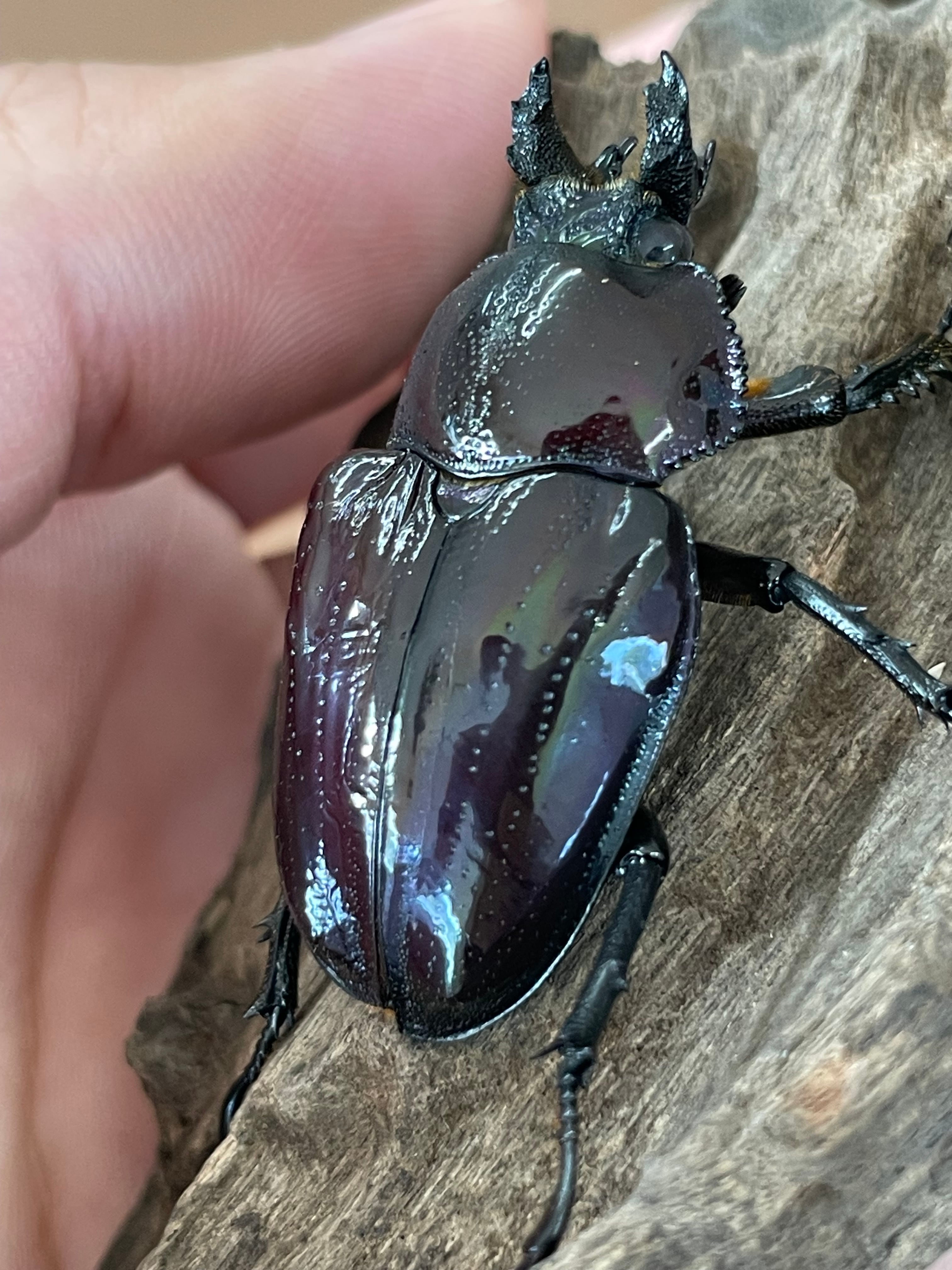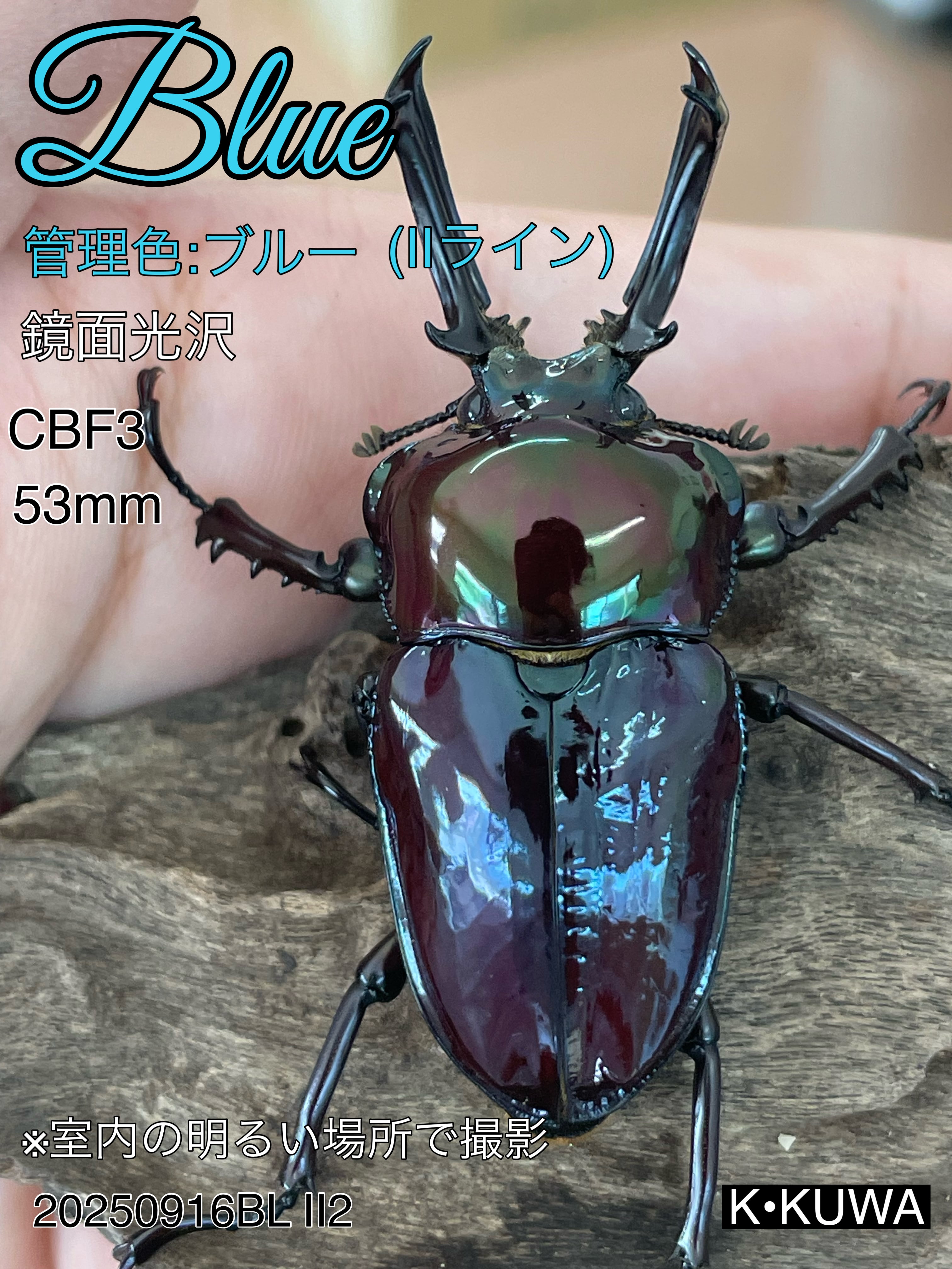 大型のブルーの鏡面光沢を目指して交配させてますが、雄の上翅は少しずつ青みが増してきているように感じます。光沢は、鏡面光沢で既に個体されていますので、兄弟は全て鏡面です。