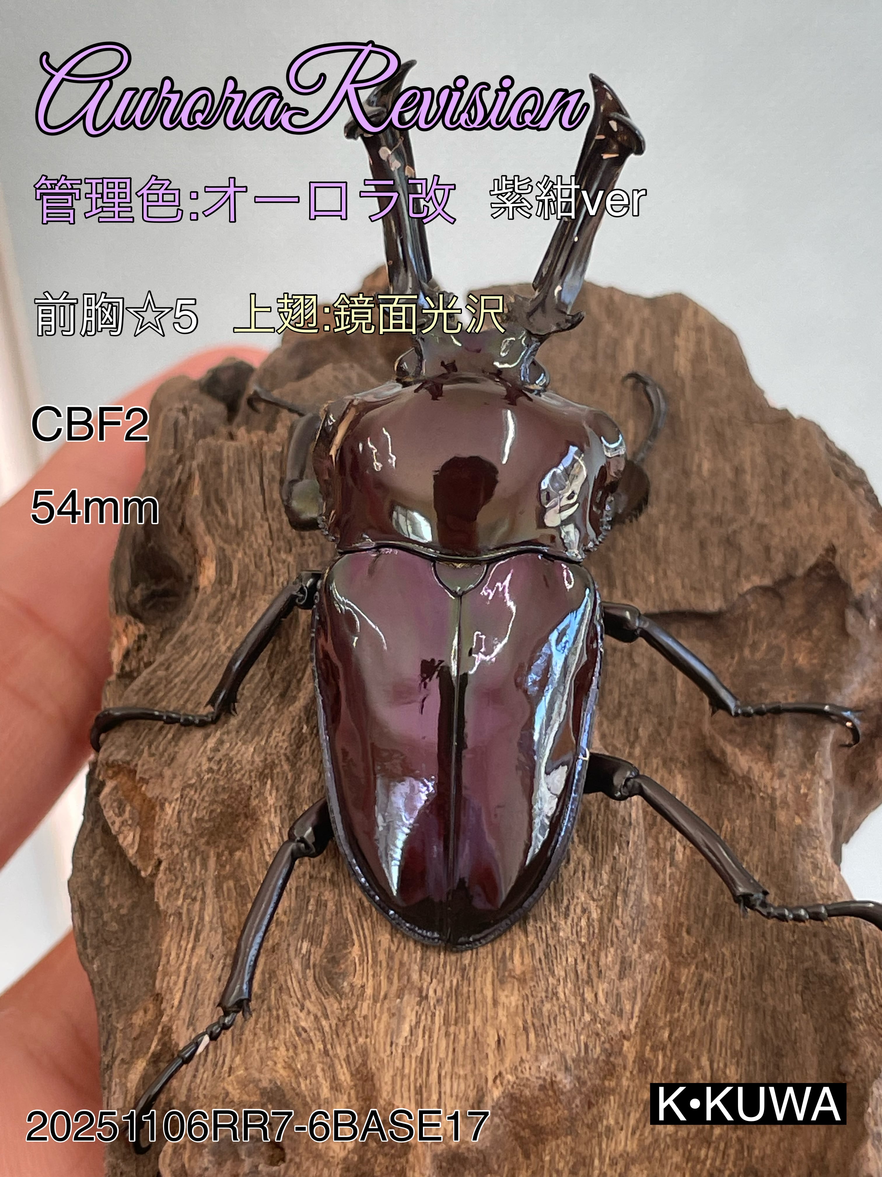 K・KUWA管理色のオーロラ、オーロラ改、ロイヤルパープルは、前胸の光沢も側面まで強光沢ですが、特徴すべきは、上翅の色と光沢にあります。